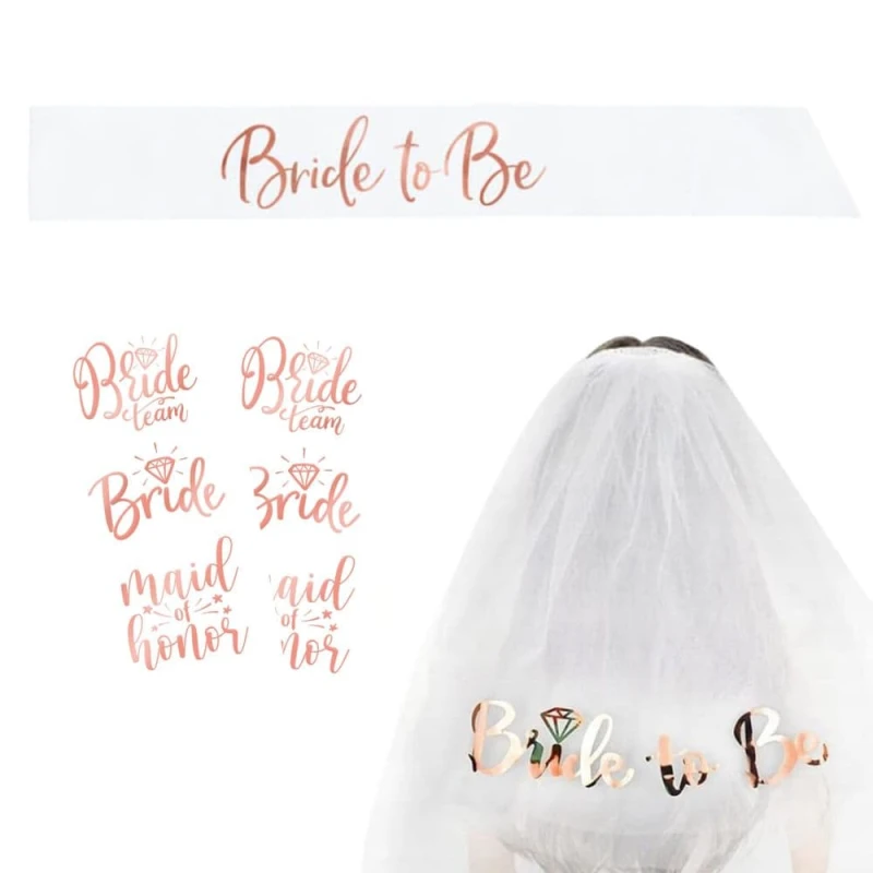 Komplet akcesoriów dla przyszłej panny młodej składa się z białego welonu z napisem Bride to Be, białej szarfy z napisem Bride to Be w kolorze różowego złota oraz tatuaży na wieczór panieński.