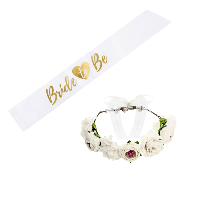 Komplet akcesoriów dla przyszłej panny młodej składa się z białego wianka oraz białej szarfy z napisem Bride to Be w kolorze złotym.