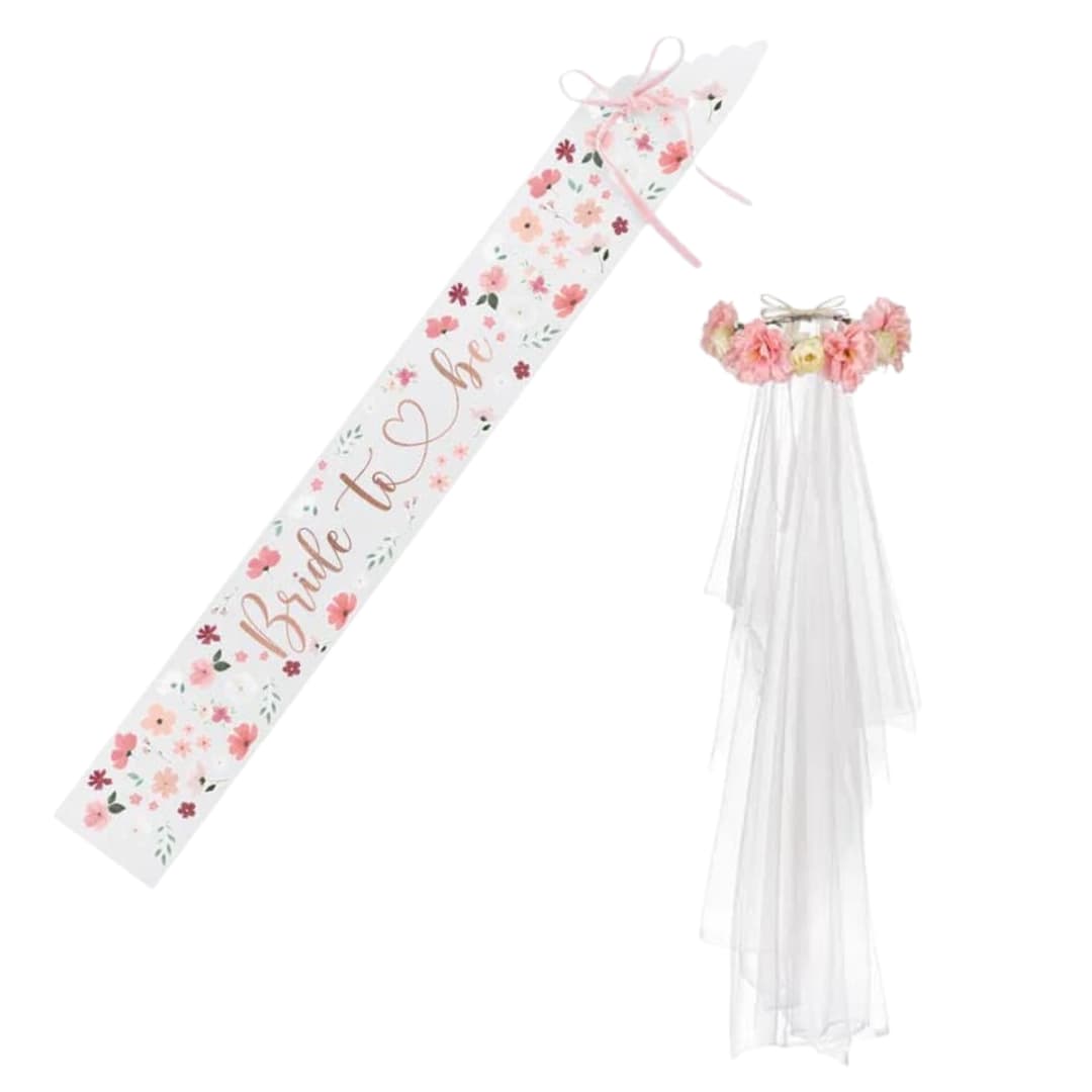 Komplet akcesoriów dla przyszłej panny młodej składa się z wianka z białym welonem oraz szarfy z napisem Bride to Be z kwiatowym motywem.