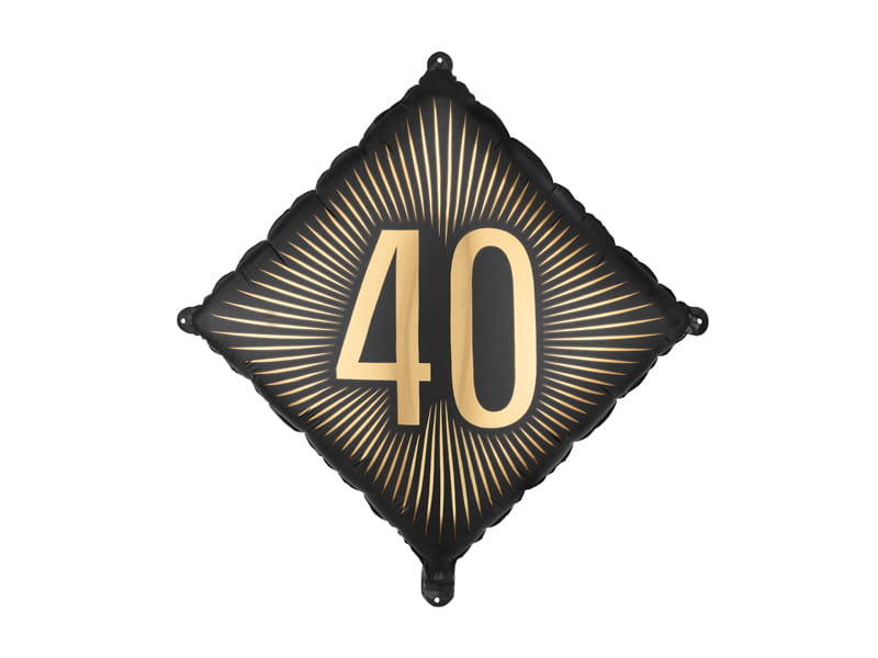 Balon foliowy "40" ma wymiary przed napompowaniem ok. 54 x 54 cm a po napompowaniu ok. 46 x 46 cm. Balon ma kolor czarny ze złotymi paskami. Może być napełniony powietrzem lub helem. W zestawie znajduje się słomka.