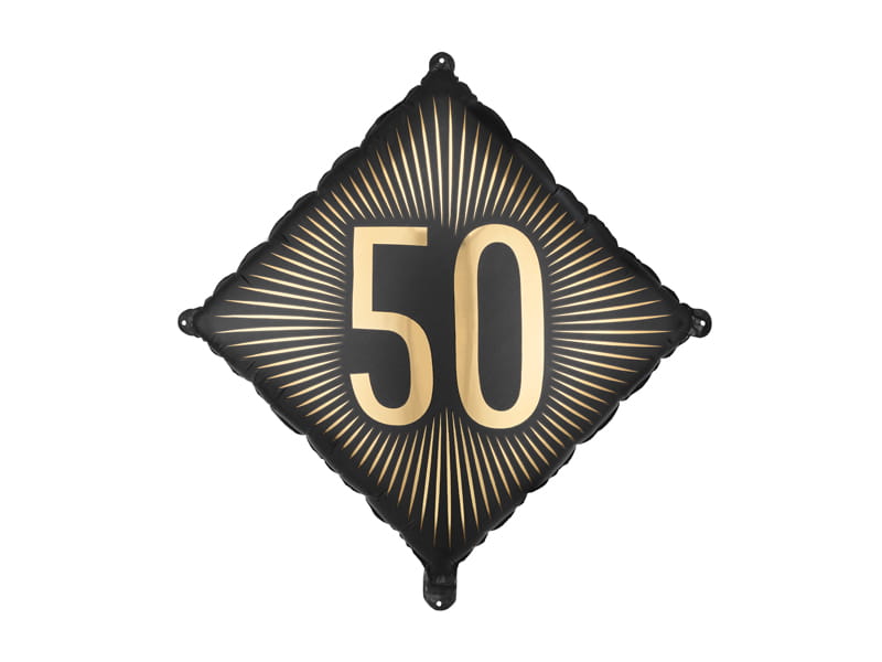 Balon foliowy "50" ma wymiary przed napompowaniem ok. 54 x 54 cm a po napompowaniu ok. 46 x 46 cm. Balon ma kolor czarny ze złotymi paskami. Może być napełniony powietrzem lub helem. W zestawie znajduje się słomka.