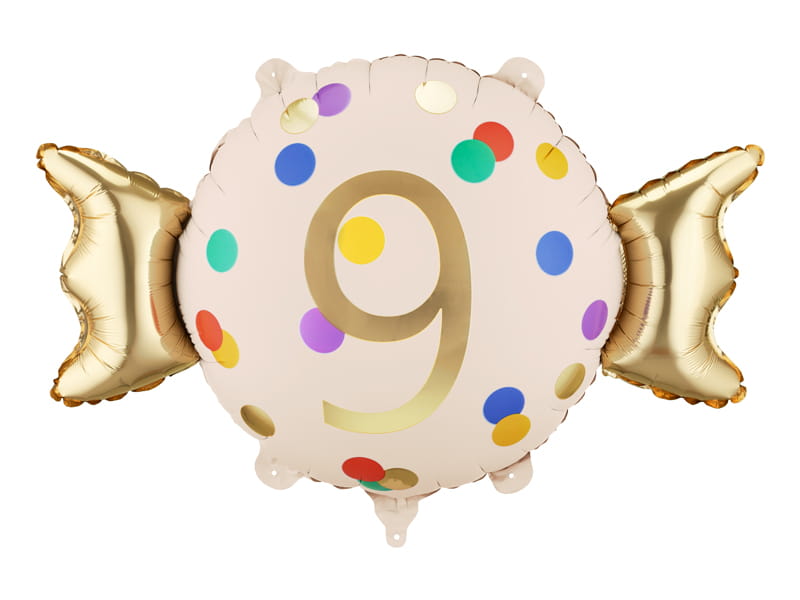 Balon foliowy "9" cukierek ma wymiary 76,5 x 48 cm przed napompowaniem oraz wymiary 61 x 37 cm po napompowaniu. Może być napełniony powietrzem lub helem. W zestawie znajduje się słomka.