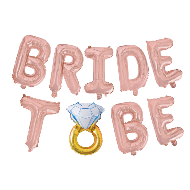 Balon foliowy Bride To Be z pierścionkiem ma kolor różowego złota (pierścionek jest złoty). Litery mają wysokość ok. 45 cm. Balony przeznaczone są do napełnienia powietrzem.