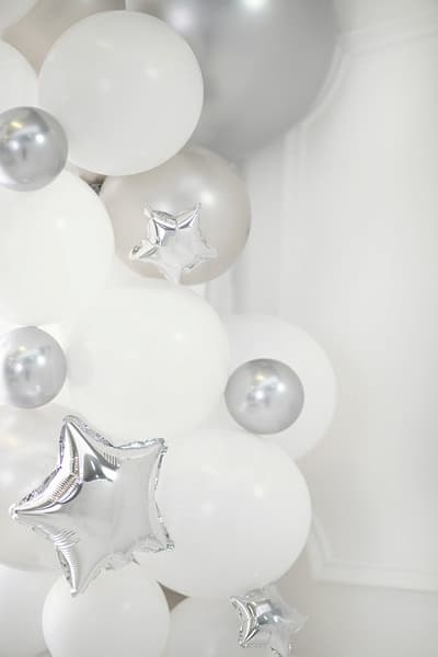 Balon gwiazdka w kolorze srebrnym świetnie sprawdzi się jako dekoracja na każde przyjęcie. Pięknie zaprezentuje się przymocowana do girlandy balonowej.