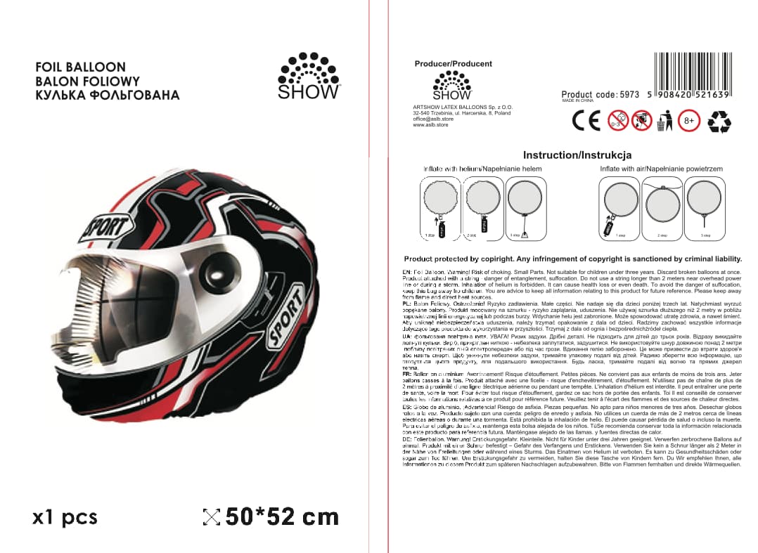 Balon foliowy kask motocyklowy ma rozmiar przed napompowaniem ok. 50x52 cm. Przeznaczony jest do napełnienia helem lub powietrzem. Unosi się po napełnieniu helem. Opakowanie zawiera 1 sztukę.