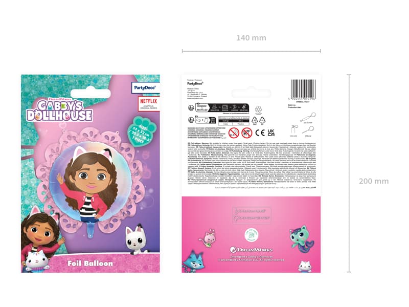 Balon foliowy Koci Domek Gabi okrągły ma rozmiar 45 cm przed napompowaniem i 35 cm po napompowaniu. Przeznaczony jest do napełnienia helem lub powietrzem. Unosi się po napełnieniu helem.