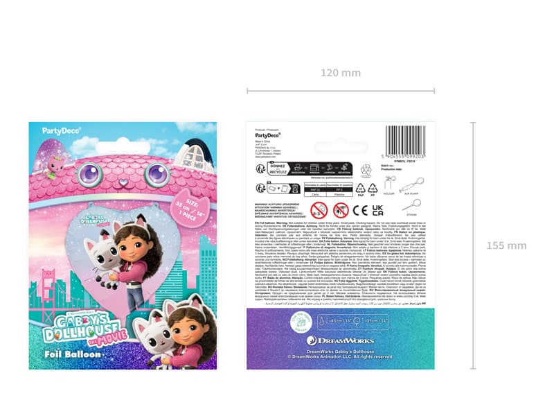 Balon foliowy Koci Domek Gabi serce ma rozmiar 45 cm przed napompowaniem i 35 cm po napompowaniu. Przeznaczony jest do napełnienia helem lub powietrzem. Unosi się po napełnieniu helem.