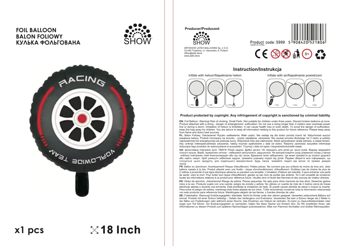 Balon foliowy Koło opona wyścigówki samochodu czerwony ma rozmiar przed napompowaniem ok. 45 cm. Przeznaczony jest do napełnienia helem lub powietrzem. Unosi się po napełnieniu helem. Opakowanie zawiera 1 sztukę.
