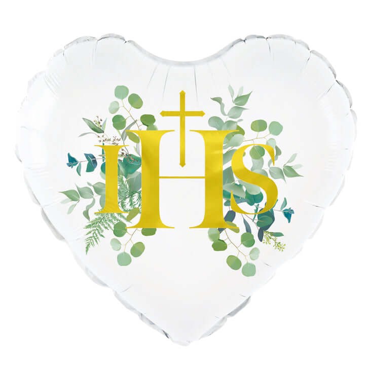 Balon foliowy na Komunie Świętą z pięknym zdobieniem w postaci złotego IHS oplecionego zielonym eukaliptusem. Taka dekoracja z pewnością przyciągnie uwagę gości, a umieszczony w centralnej części wraz z innymi dekoracjami z serii Komunii Świętej stworzy niesamowity efekt. Będzie wyglądał pięknie zarówno jako dekoracja pomieszczenia, ale również jako dodatek do prezentu dla komunikanta.