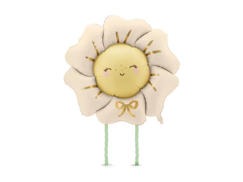 Balon foliowy rumiany Kwiatuszek w kolorze beżowym ma wymiary 104 x 104 cm przed napompowaniem i ok. 80 x 80 cm po napompowaniu. Przeznaczony do nadmuchania helem. Wysokość nóżek to ok. 40 cm. Zestaw zawiera słomkę.