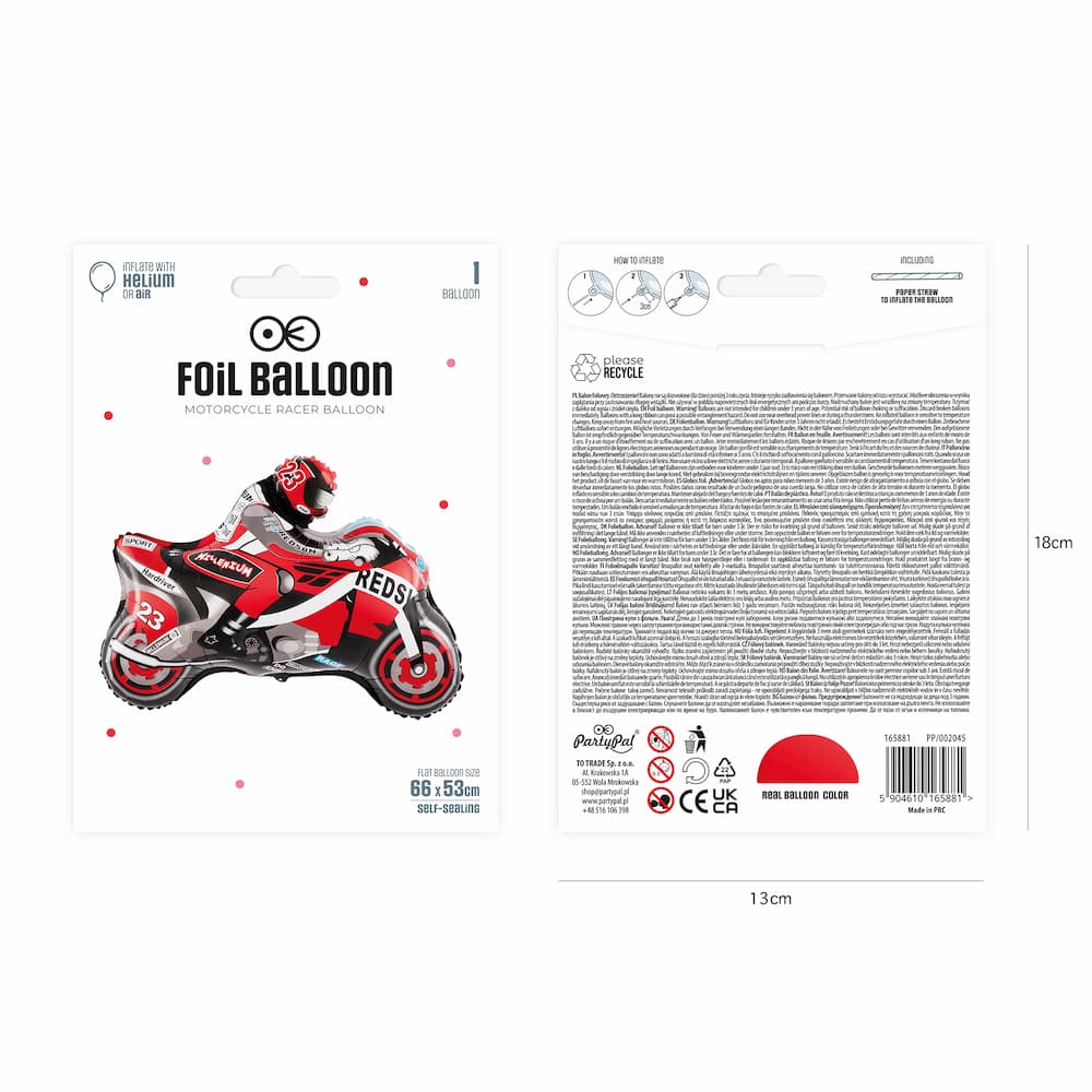 Balon foliowy czerwony Motor ma szerokość 66 cm i wysokość 53 cm. Do balonu dołączona jest słomka. Przeznaczony jest do napełnienia helem lub powietrzem. Unosi się po napełnieniu helem.