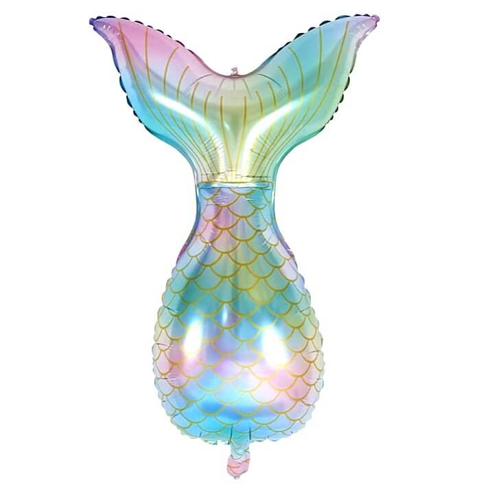 Piękny, kolorowy balon foliowy ogon syreny to wspaniała dekoracja na syrenie przyjęcie. Połączenie kolorów zielonego, niebieskiego i różowego w różnych odcieniach wspaniale wygląda razem ze złotymi łuskami.