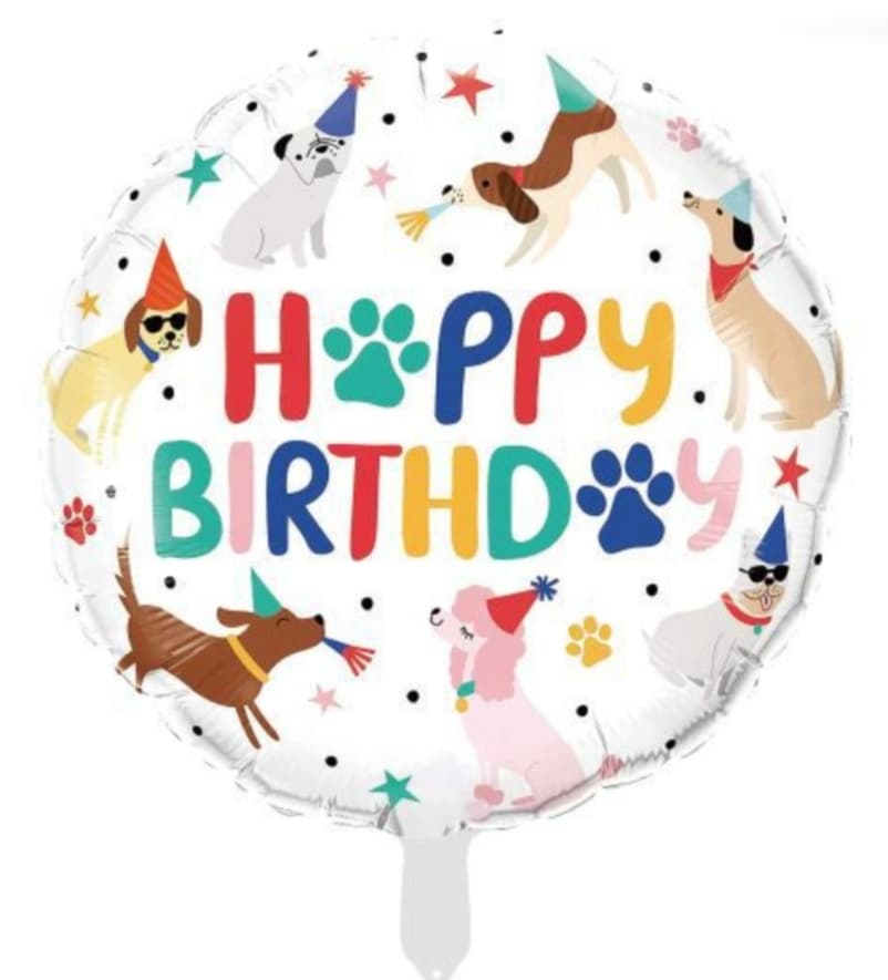 Balon foliowy z nadrukiem piesków i napisem Happy Birthday ma rozmiar ok. 45 cm przed napompowaniem. Można go napełnić helem lub powietrzem. Unosi się po napełnieniu helem. W opakowaniu znajduje się 1 sztuka.