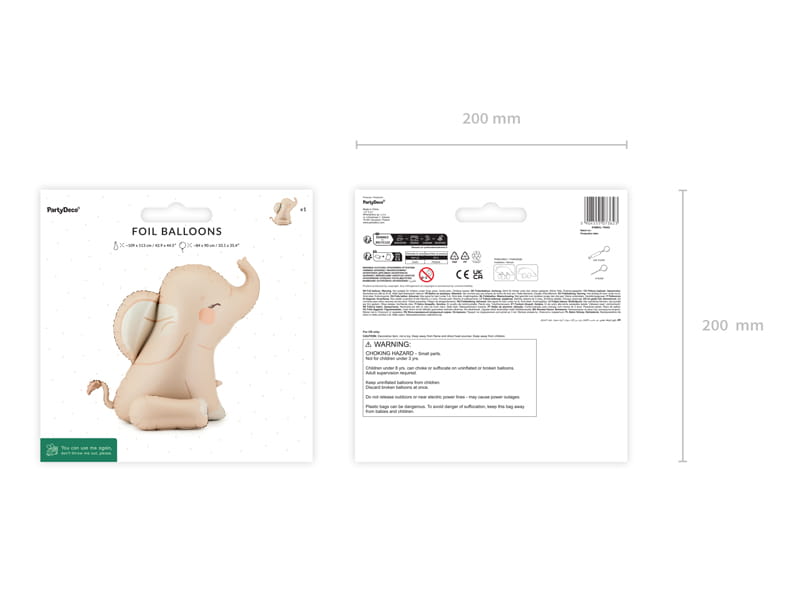 Balon foliowy siedzący Słonik w kolorze beżowym ma wymiary ok. 109 x 113 cm przed napompowaniem i ok. 84 x 90 cm po napompowaniu. W opakowaniu znajduje się korpus oraz nogi. Przed napompowaniem należy umieścić nogi w zaznaczonych otworach w korpusie. Przeznaczony jest do napełnienia wyłącznie powietrzem. W opakowaniu znajduje się słomka. Balon jest samouszczelniający się.