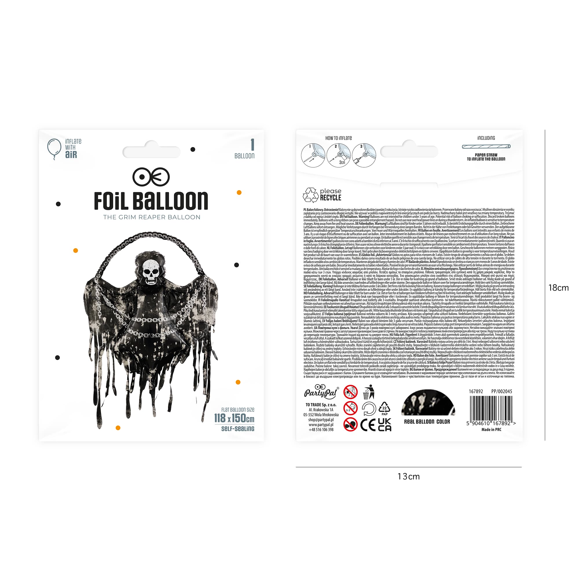 Balon foliowy Śmierć z łańcuchami na Halloween ma szerokość przed napompowaniem ok. 118 cm i wysokość przed napompowaniem ok. 150 cm. Do balonu dołączona jest słomka. Przeznaczony do napełnienia helem lub powietrzem. Balon unosi się po napełnieniu helem.