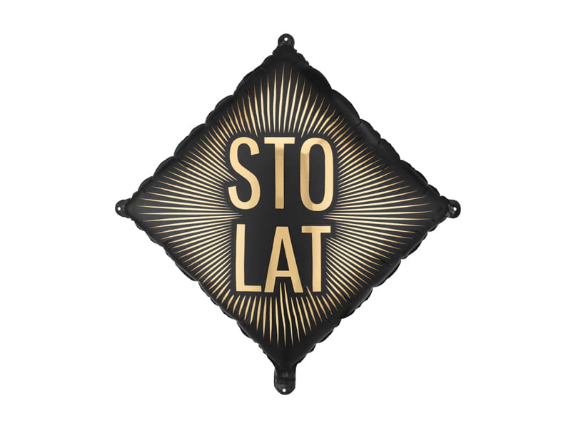 Balon foliowy "Sto Lat" ma wymiary przed napompowaniem ok. 54 x 54 cm a po napompowaniu ok. 46 x 46 cm. Balon ma kolor czarny ze złotymi paskami. Może być napełniony powietrzem lub helem. W zestawie znajduje się słomka.