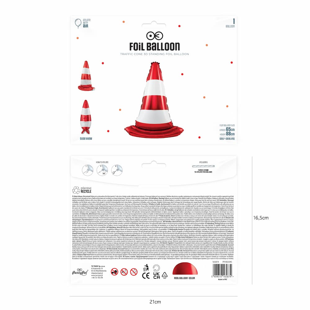 Balon foliowy stojący Pachołek drogowy ma szerokość 65 cm i wysokość 88 cm. Do balonu dołączona jest słomka. Przeznaczony jest do napełnienia powietrzem. Nie unosi się po napełnieniu helem.