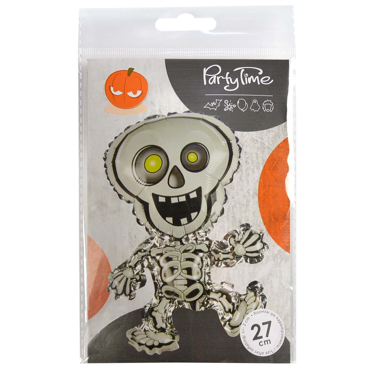 Balon foliowy Szkielet ma rozmiar 27 cm. Przeznaczony jest do napełnienia powietrzem.