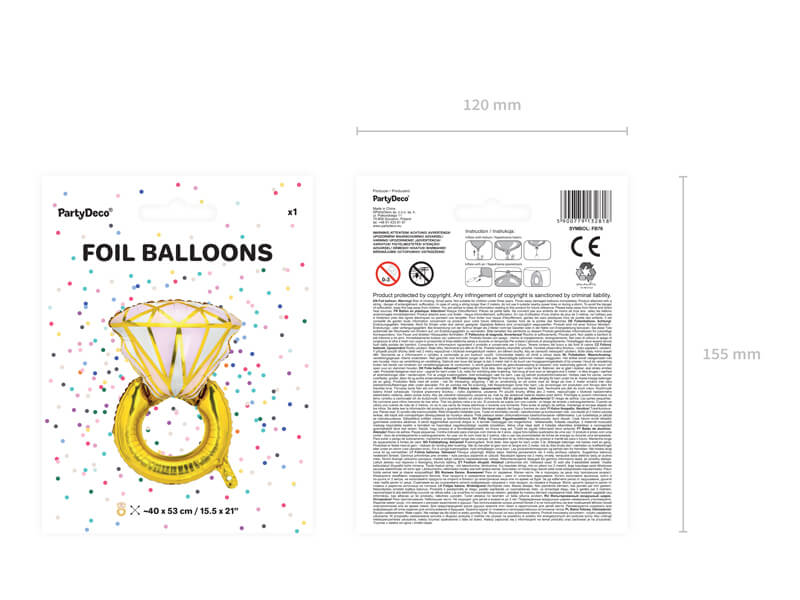 Balon foliowy złoty pierścionek ma wymiary ok. 56 x 75 cm po napełnieniu. Może być napełniony powietrzem lub helem. W opakowaniu znajduje się 1 sztuka.
