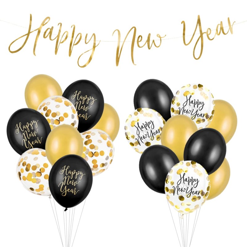 Taniej w zestawie!- Czarne balony sylwestrowe ze złotym napisem Happy New Year