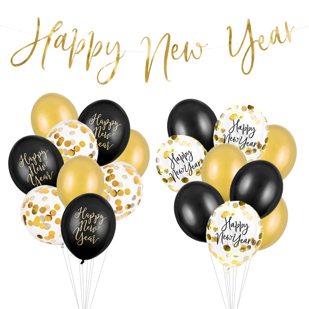W balonowym zestawie sylwestrowym znajduje się 18 balonów (3 czarne Happy New Year 30 cm, 3 przezroczyste Happy New Year z konfetti 30 cm, 3 przezroczyste z konfetti 30 cm, 3 czarne strong 30 cm, 6 złotych strong 30 cm) oraz złoty baner Happy New Year