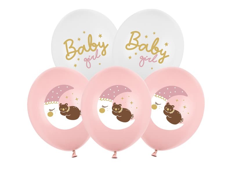 Lateksowe balony Baby Girl z misiem na księżycu mają średnicę ok. 30 cm. Można je napełnić helem lub powietrzem. Unoszą się po napełnieniu helem. W opakowaniu znajdują się dwa wzory oraz 6 balonów — 3x biały balon z napisem Baby Girl, 3x różowy balon z nadrukiem misia na księżycu.