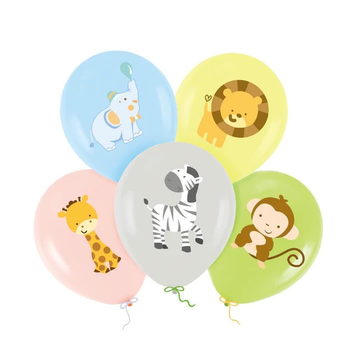Zestaw balonów z nadrukiem zwierzątek zamieszkujących dzikie zakątki dżungli pozwolą wprowadzić na twoje przyjęcie mnóstwo ciekawej atmosfery. Urokliwy słonik, żyrafka, zebra, lew i małpka perfekcyjnie wprowadzą gości w świat tropików, gdzie uśmiechom nie ma końca a zabawa jest niekończącą się przygodą.