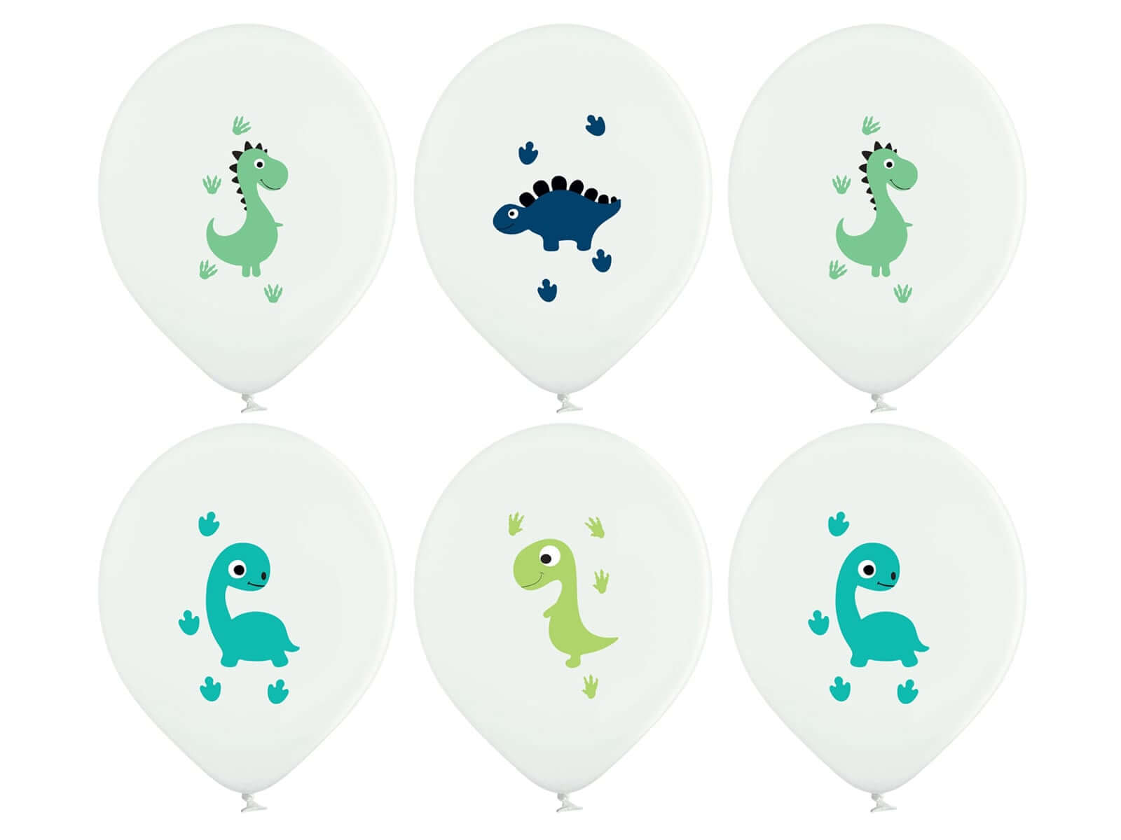 Balony z nadrukiem Wesołe Dinozaury są w kolorze białym z kolorowym dinozaurem w 4 wzorach. Balony mają rozmiar ok. 25 x 37 cm po napompowaniu. W opakowaniu znajduje się 6 sztuk.