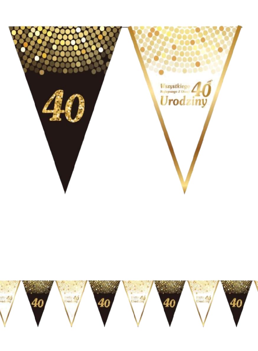Urodzinowe flagi na 40 urodziny w kolorze czarno-złotym mają długość ok. 250 cm. W komplecie znajduje się 12 flag o wymiarach 20 × 30 cm.