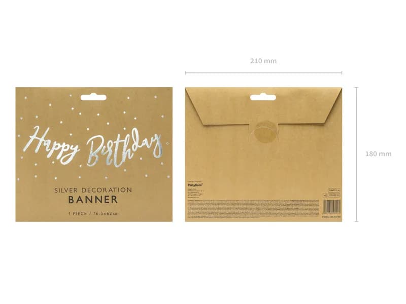 Baner Happy Birthday w kolorze srebrnym lustrzanym ma długość ok. 62 cm i wysokość ok. 16,5 cm. Papierowe litery są przyszyte do sznureczka, dzięki czemu baner jest od razu gotowy do powieszenia.