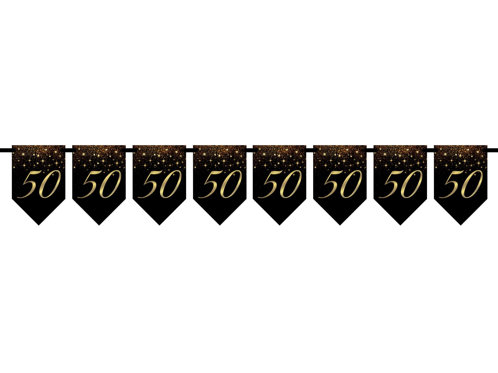 Pięćdziesiątka to kamień milowy w życiu! Nasz baner na 50. urodziny, z czarnymi proporczykami i złotymi cyframi „50”, stworzy uroczysty i elegancki klimat na twojej imprezie. Subtelne, błyszczące detale podkreślą wyjątkowość tego momentu, dodając blasku każdemu przyjęciu.
