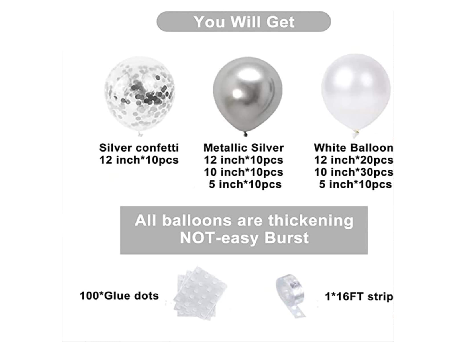 Girlanda balonowa biało-srebrna posiada w zestawie: