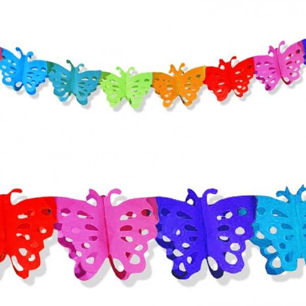 Girlanda bibułowa kolorowe motylki to wspaniała dekoracja na dziecięce przyjęcie. Wspaniale sprawdzi się na karnawałowych imprezach w przedszkolach i żłobkach.