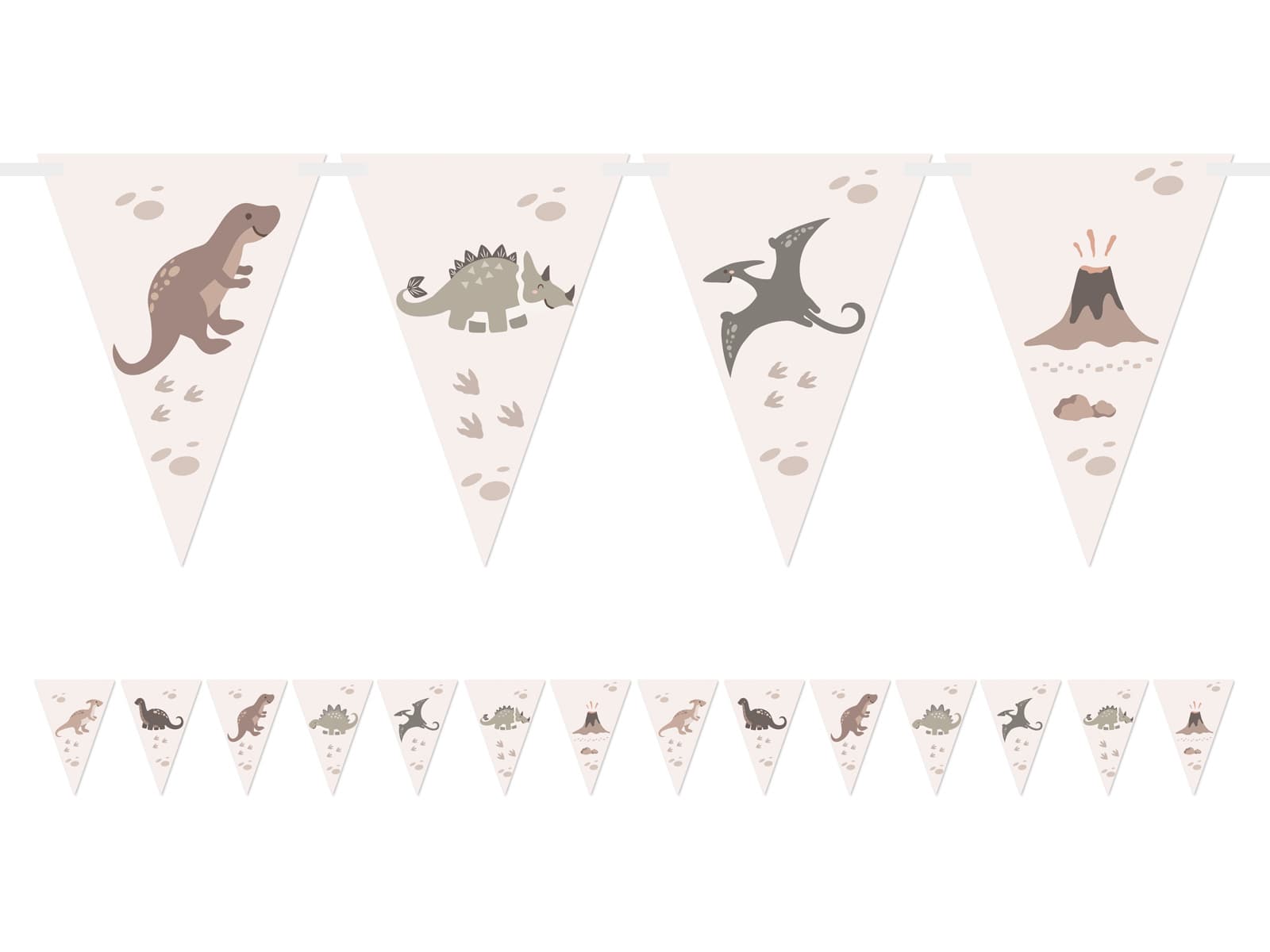 Dinozaury nadciągają na Twoje przyjęcie! 5-metrowa girlanda z flagami w prehistorycznym stylu to idealna dekoracja na kinderbale, urodziny małych odkrywców i imprezy tematyczne. Można rozwiesić ją w ogrodzie, na ścianie lub nad stołem, by stworzyć niesamowitą scenerię rodem z epoki dinozaurów! Świetnie komponuje się z innymi ozdobami z kolekcji.