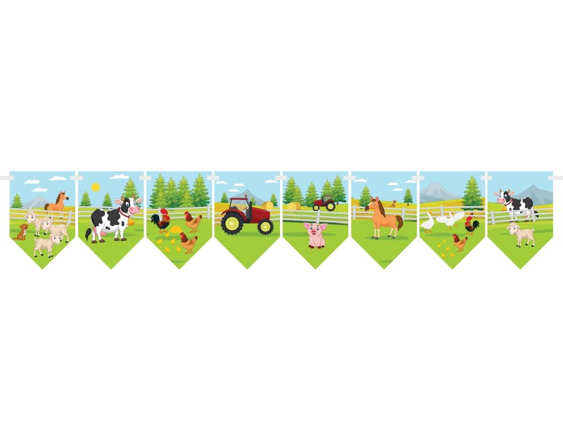 Girlanda flagi Farma ma długość ok. 165 cm. Wymiary flag wynoszą 10 × 15 cm. W komplecie znajduje się tasiemka o długości 500 cm. Odległości pomiędzy flagami można samodzielnie zmieniać. Długość girlandy wyniesie 165 cm przy założeniu ok. 12 cm przerw między flagami.