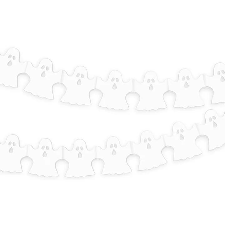 Girlanda na Halloween w kształcie białych duszków ma długość ok. 260 cm. Wymiary duchów to 10,5 × 12 cm. Wykonana jest z papieru.
