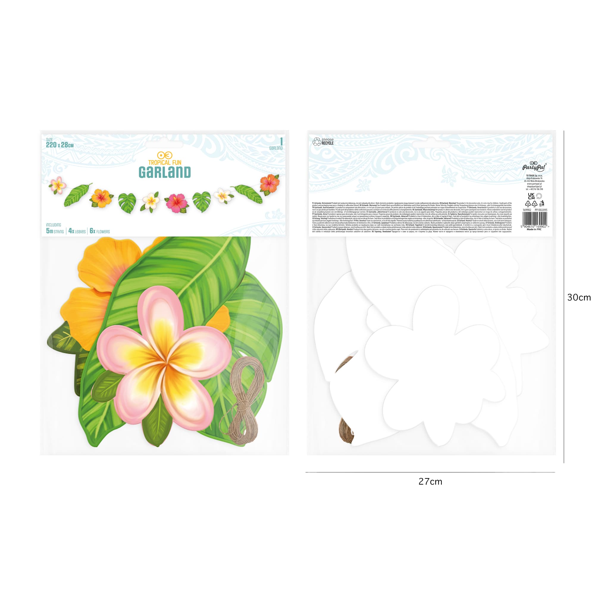 Girlanda papierowa Aloha tropikalne kwiaty i liście ma wysokość ok. 28 cm i długość 220 cm. W zestawie znajduje się 6 tropikalnych kwiatów i 4 liście. Do zestawu dołączony jest sznureczek o długości 500 cm. Girlanda do samodzielnego złożenia.