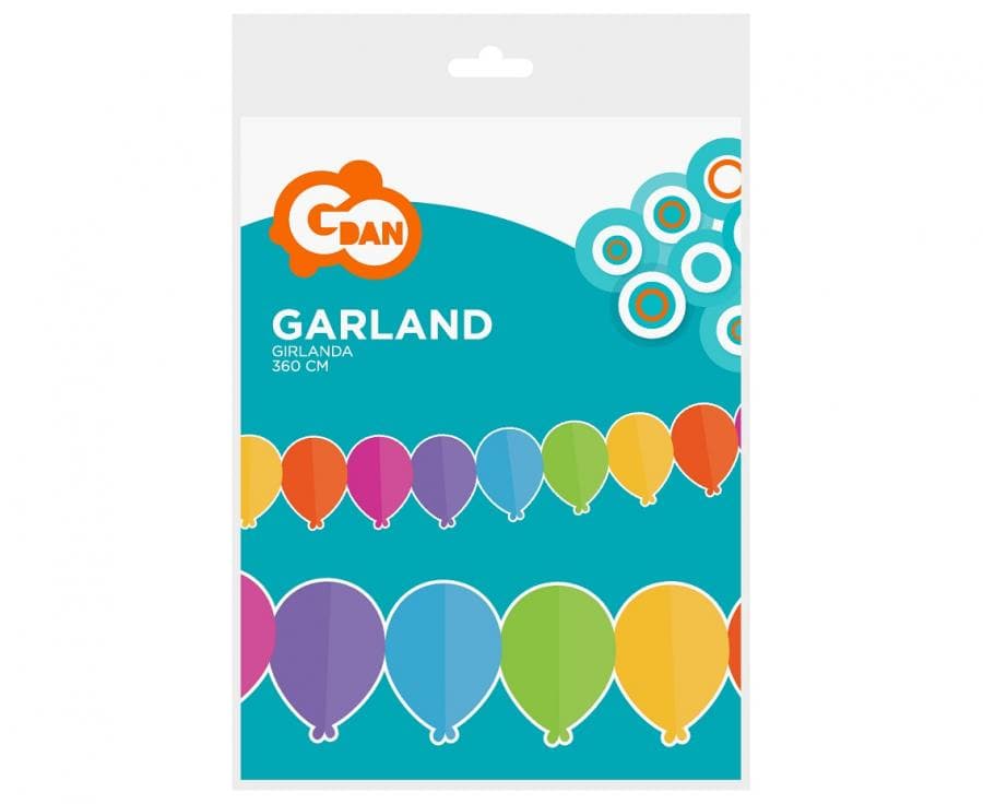 Girlanda papierowa w kształcie baloników ma długość 360 cm. Pojedyncze balony mają wymiar 13,3 × 18 cm. Połączone są ze sobą cienką, lecz wytrzymałą nitką. Girlanda jest dwustronna.