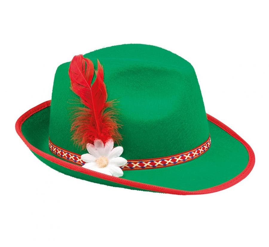 Kapelusz tyrolski filcowy zielony z kwiatkiem i czerwonym piórkiem ma obwód ok. 59 cm. Wykonany jest z poliestru.