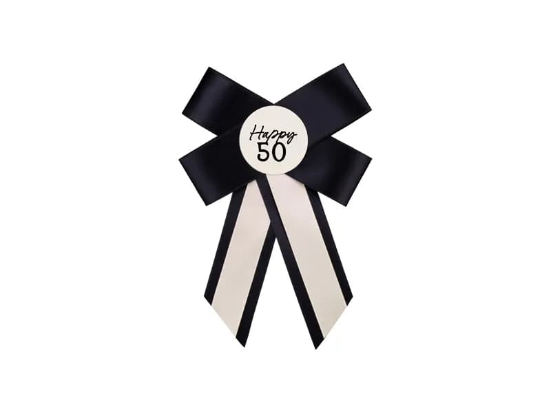Kotylion kokarda na 50 urodziny w kolorze kremowym i czarnym ma wymiary ok. 11 × 17 cm. Wyposażony jest w agrafkę.