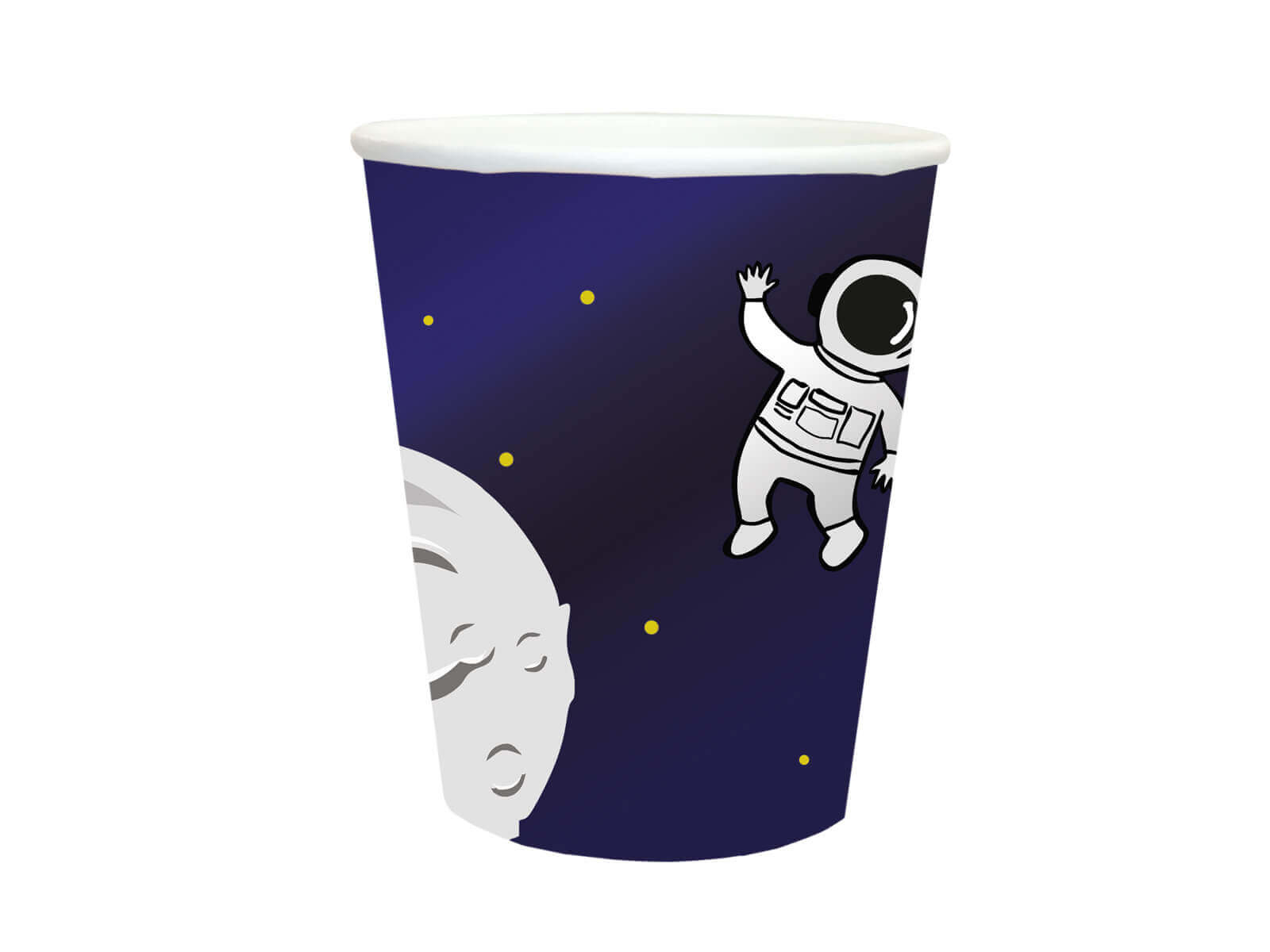 Kubeczki papierowe Kosmos wspaniale sprawdzą się na przyjęciu małego miłośnika przestworzy. Wraz z innymi elementami z kolekcji- talerzykami, słomkami czy wiszącymi dekoracjami, stworzą prawdziwą kosmiczną oprawę.