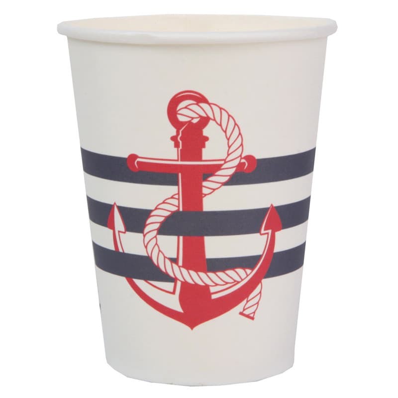 Kubeczki papierowe w paski Morskie mają pojemność 250 ml. W opakowaniu znajduje się 10 sztuk.