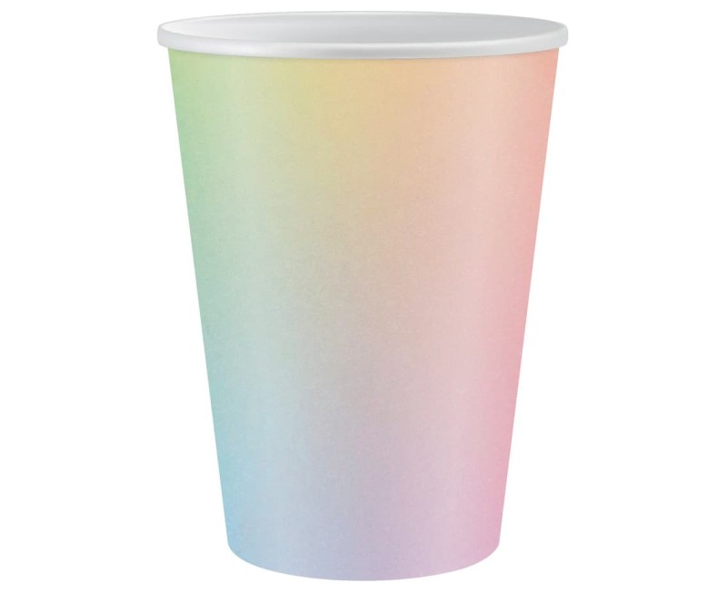 Kubeczki papierowe tęczowe mają pojemność 266 ml. W opakowaniu znajduje się 6 sztuk. Wykonane są z papieru z dodatkiem powłoki uszczelniającej z tworzywa sztucznego.