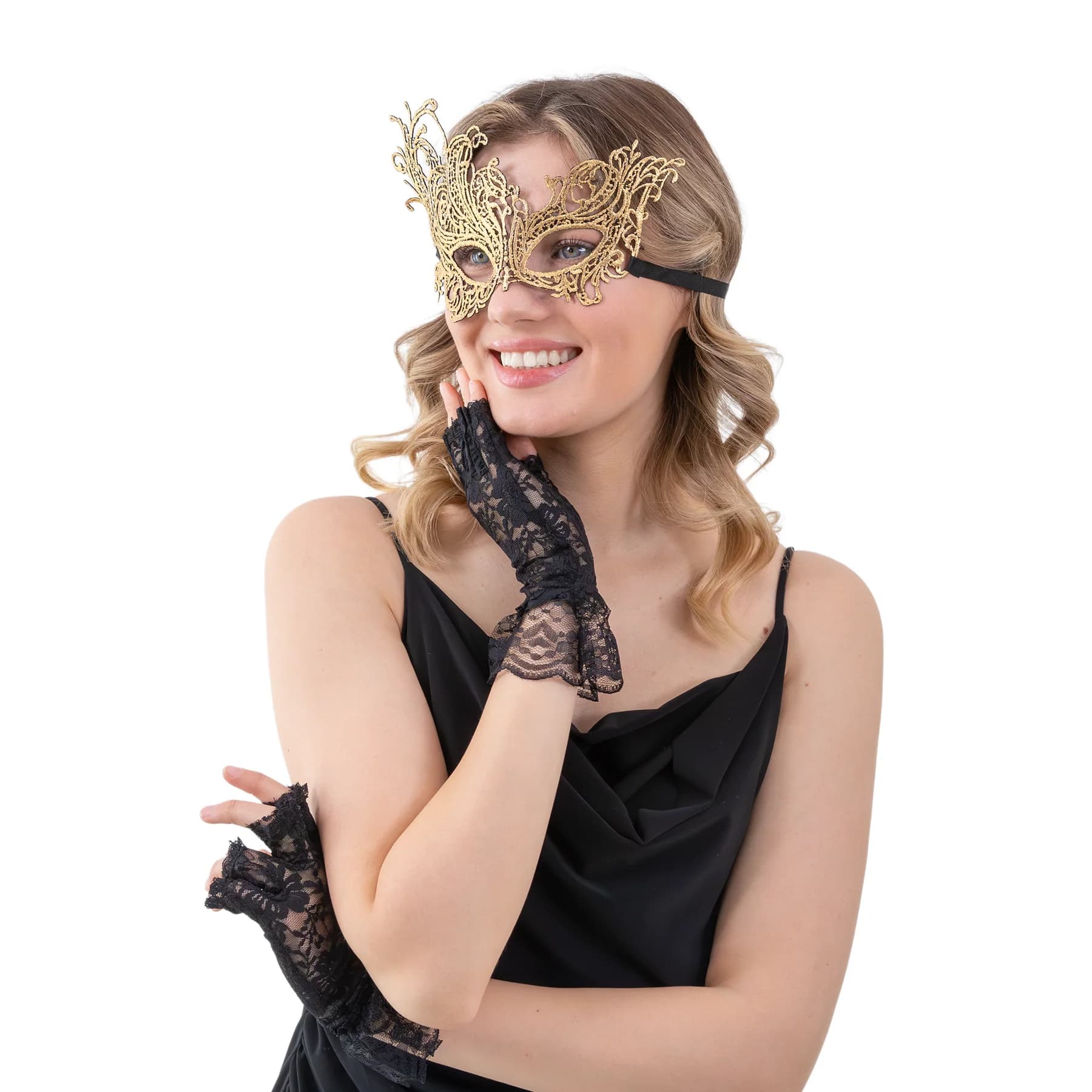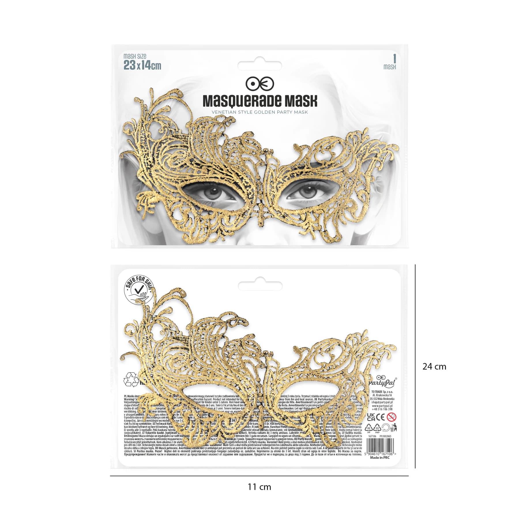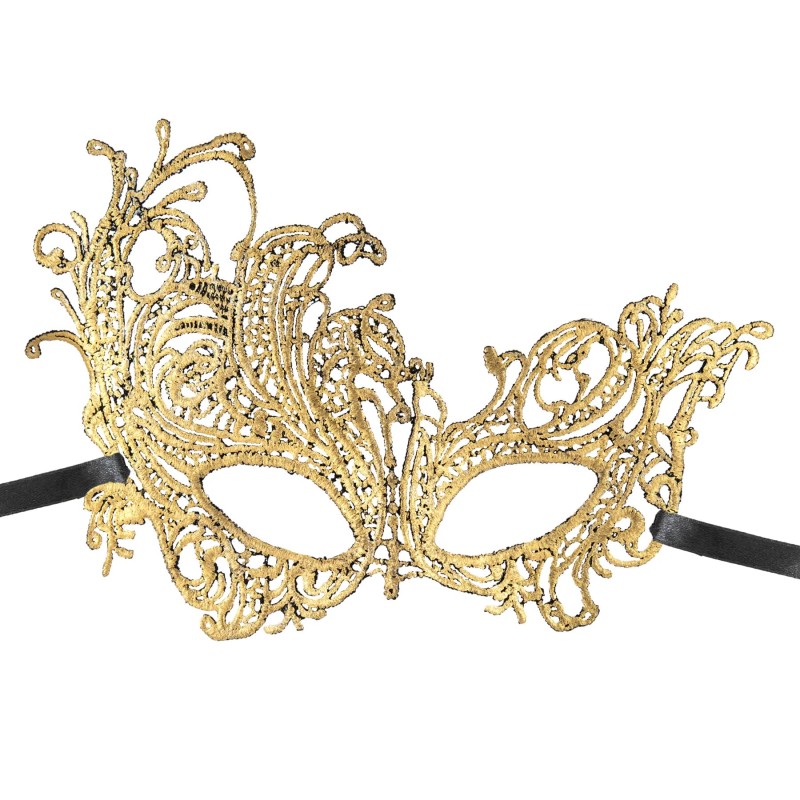 Maska na oczy koronkowa w kolorze złotym ma szerokość ok. 23 cm i wysokość ok. 14 cm. W opakowaniu znajduje się 1 sztuka.
