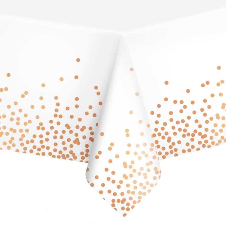 Biały obrus foliowy z kropkami rose gold na krawędziach imitującymi konfetti wspaniale sprawdzi się do zabezpieczenia stołu na przyjęciu, szczególnie dziecięcym. Gdy coś się wyleje lub ubrudzi, wystarczy wytrzeć szmatką.
