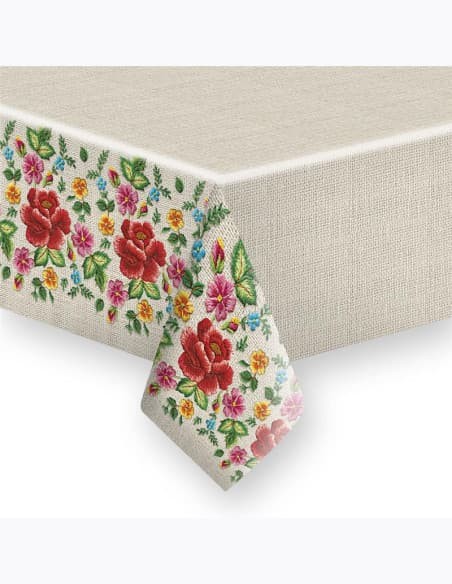 Obrus papierowy z nadrukiem Haft Kwiaty Folk ma wymiary 120x180 cm.