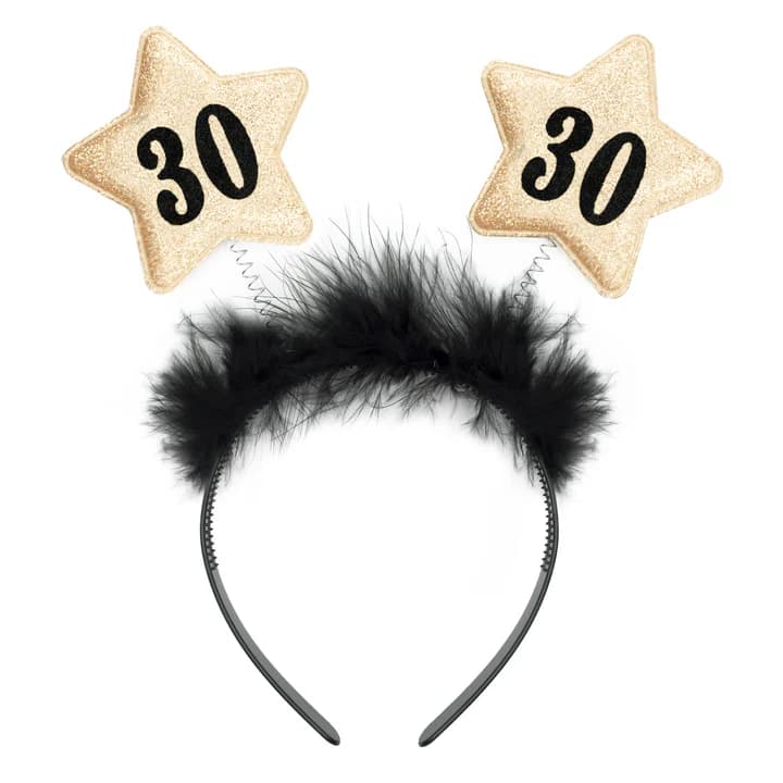 Opaska na głowę na 30 urodziny to zabawny i stylowy dodatek, który sprawi, że poczujesz się jak gwiazda wieczoru. Złote gwiazdki z wyraźnym napisem "30" dumnie poruszają się na sprężynkach, tworząc efekt pełen ruchu i energii. To gadżet, który nie tylko wyróżni Cię w tłumie, ale też doda odrobiny humoru i luzu na imprezie.