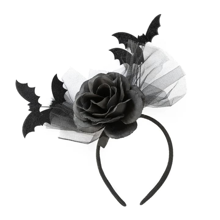 Opaska na głowę Halloween Róża Nietoperze ma wymiary 26 × 26 cm. Rozmiar uniwersalny.