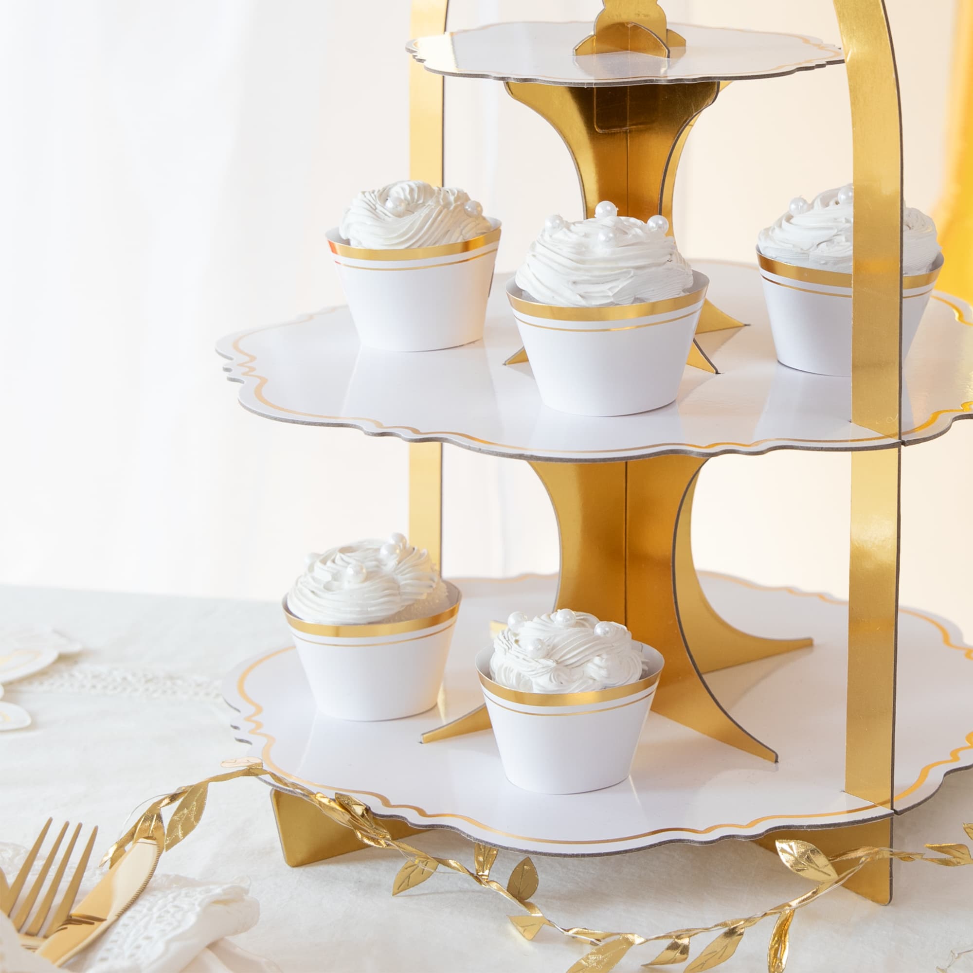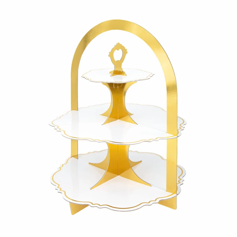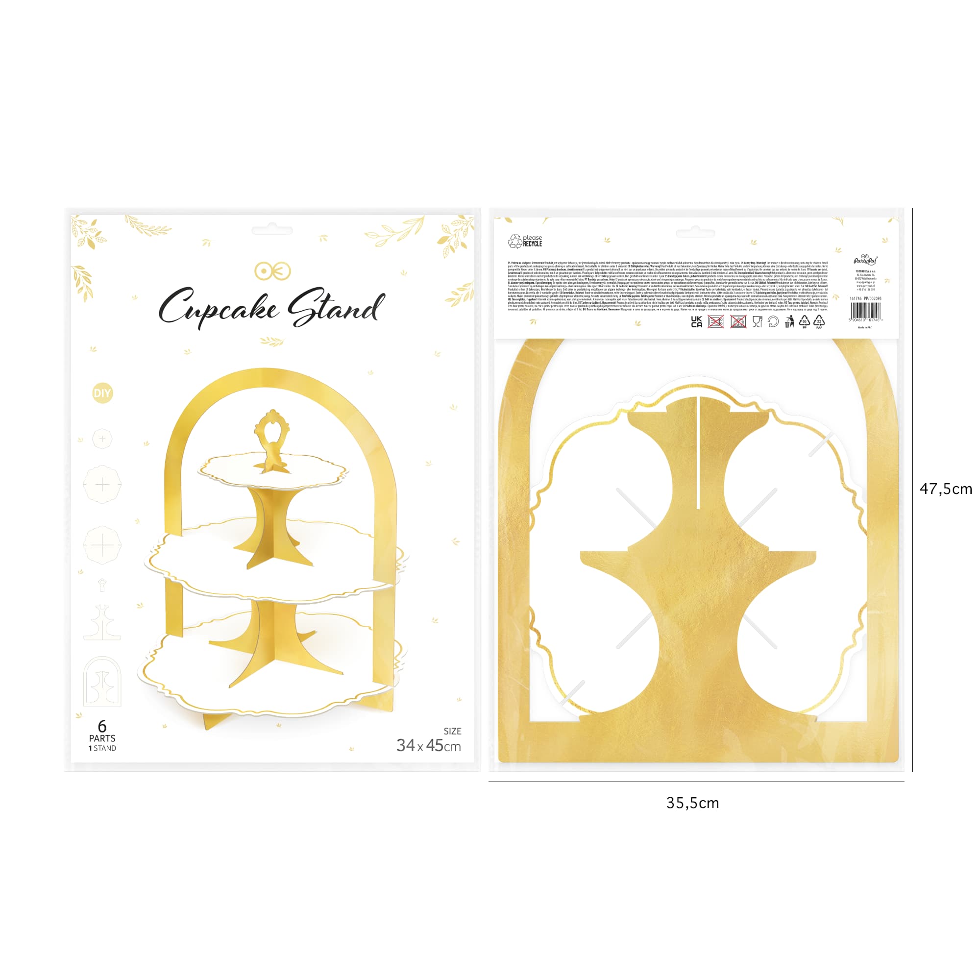 Biało-złota patera do babeczek lub ciast ma trzy poziomy. Wykonana jest ze sztywnej tektury. Jej wysokość wynosi ok. 45 cm, a szerokość ok. 34 cm. Patera jest do samodzielnego złożenia. Opakowanie zawiera 1 sztukę.