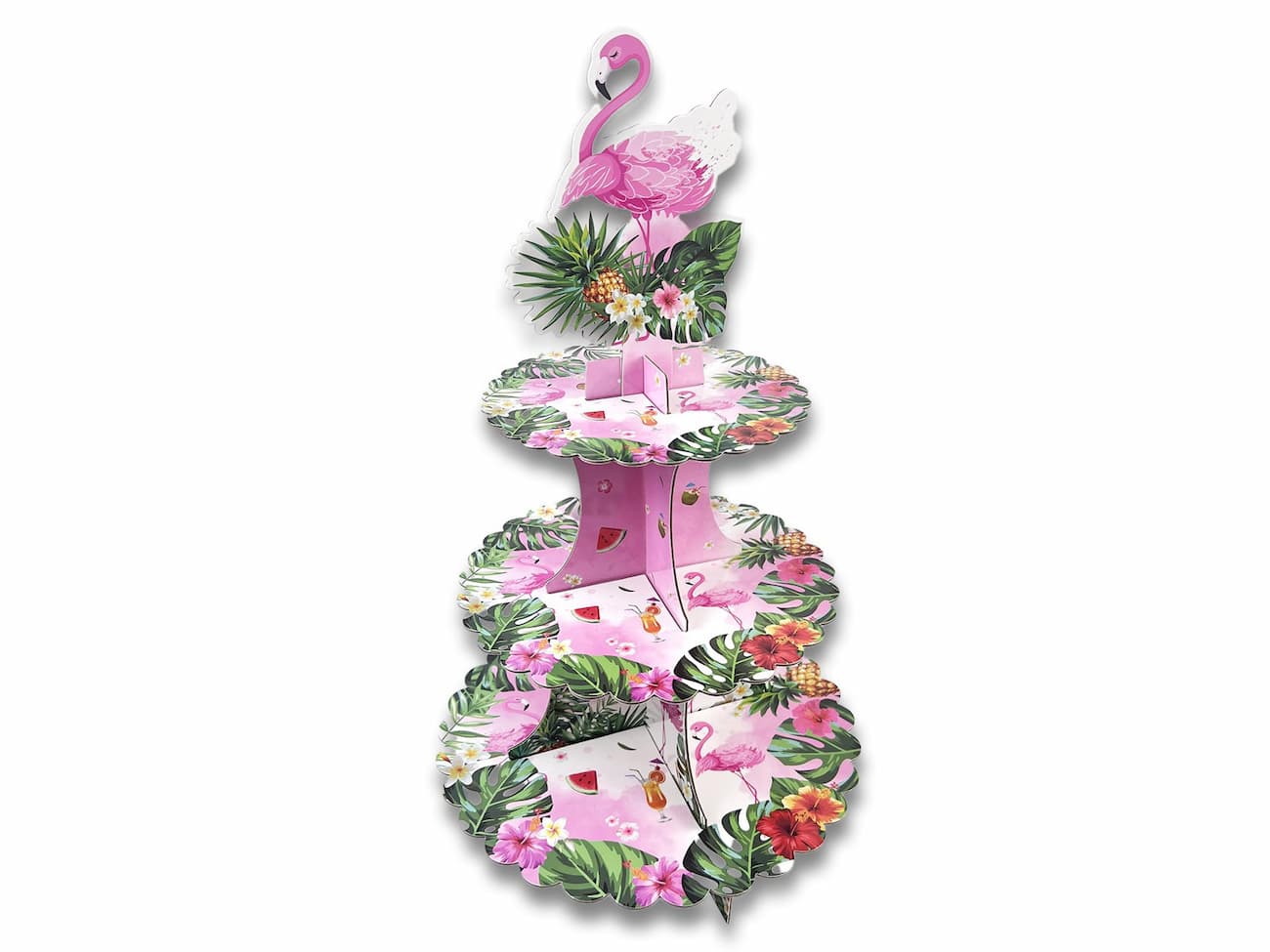 Patera na ciasto z motywem hawajskim posiada 3 piętra o średnicy 28 cm, 23 cm, 16 cm. Wysokość to ok. 45 cm.
